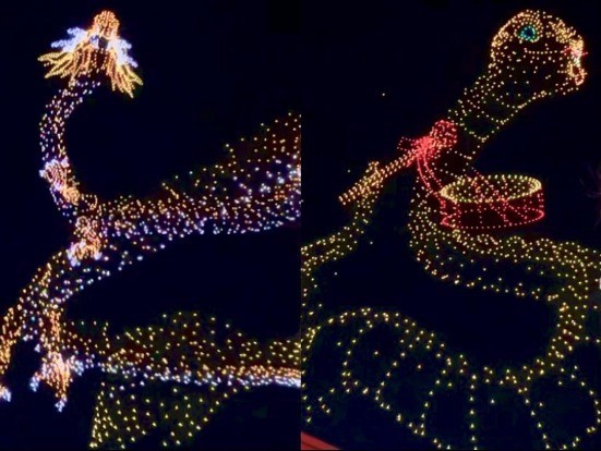 夜幕降临,三千架无人机腾空而起,在星空之下灵动变幻,拼出“龙蛇共舞”“福满人间”等极具新春寓意的光影画卷,令游客叹为观止。